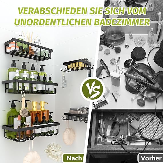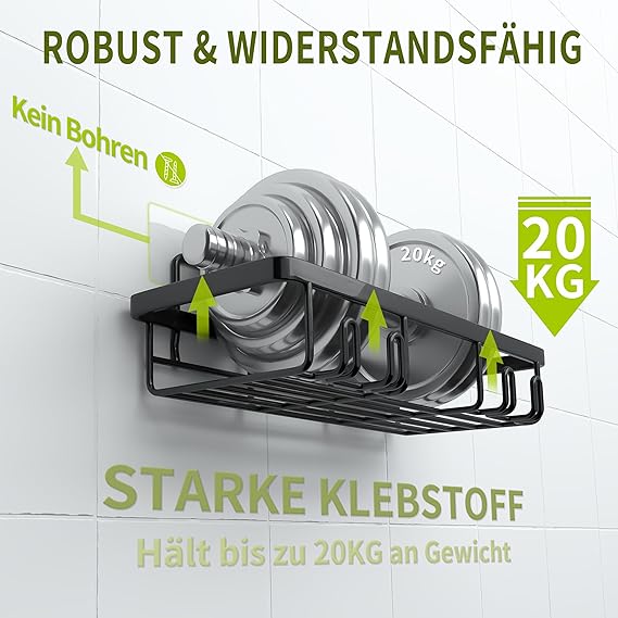 Delme yok, 20 kg taşıma kapasitesi: Duş rafı seti delmeden monte edilebilir ve duvara zarar vermez. Yapmanız gereken tek şey folyoyu sökmek ve yapıştırmak için yapıştırıcıyı sürün. Güncellenmiş kalıntı bırakmayan yapıştırıcı size daha yüksek bir dayanıklılık sunar. Daha güçlü bir yapışma özelliğine sahiptir, kolay asılır, sallanmaz ve düşmesini önler. Taşıma kapasitesi 20 kg’a kadar olup size daha yüksek bir dayanıklılık sunar