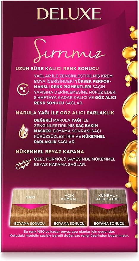 Boya Setinin İçeriği: 1 Tüp Kalıcı Krem Boya 50ml 1 Oksidan Losyonlu Uygulama Şişesi 50ml 1 Boyama Sonrası Zengin Saç Bakım Maskesi 15ml 1 Çift Eldiven 1 Kullanma Kılavuzu