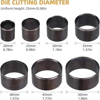 ★ 7 Boyutlu Deri Kesme Kalıpları – Bu deri kesim kalıpları doğru şekle sahiptir ve ihtiyaçlarınızı karşılamak için 7 farklı boyut sunuyoruz. (Çap: 20 mm/0,79 inç, 25 mm/0,98inç, 30 mm/1,18 inç, 35 mm/1,38 inç, 40 mm/1,57 inç, 45 mm/1,77 inç, 50 mm/1,97 inç)