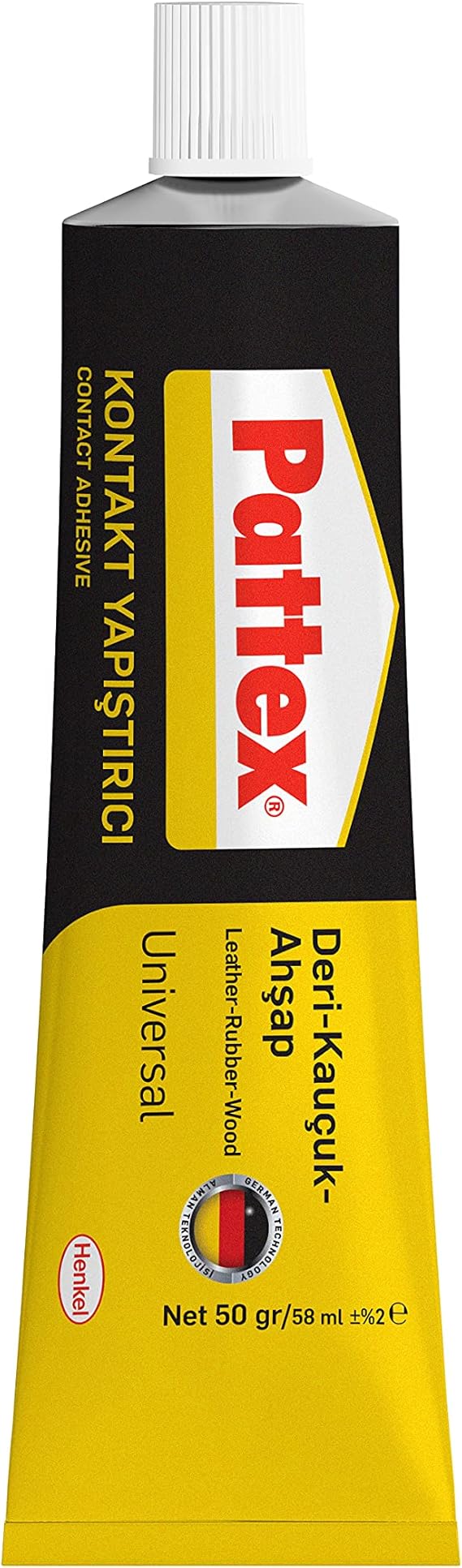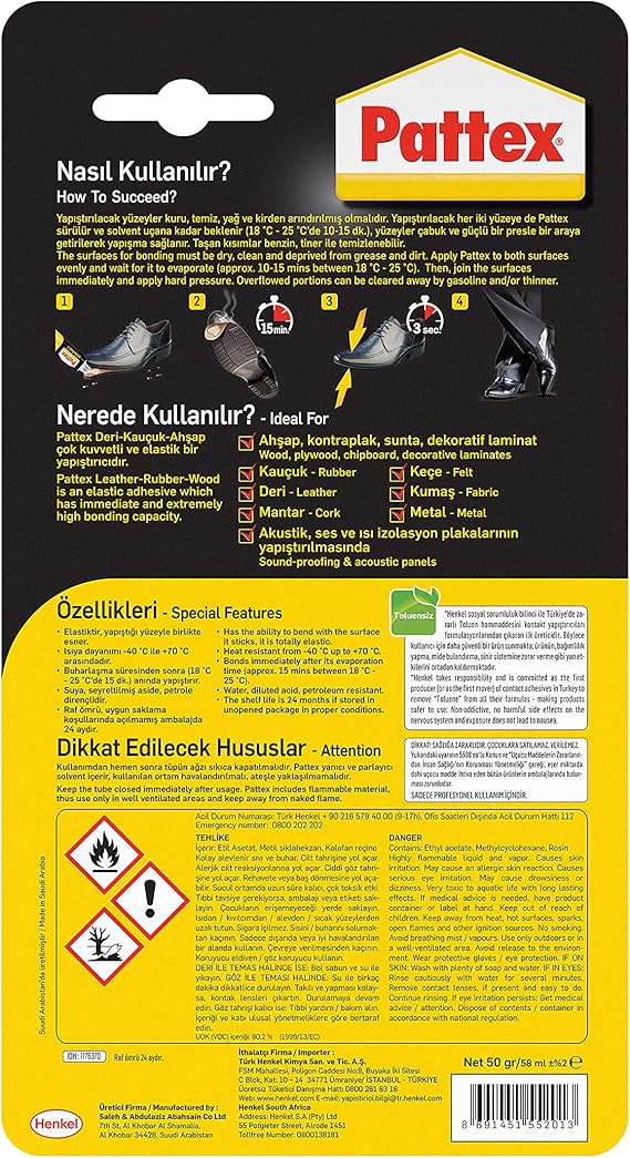 Ambalaj içeriği – Pattex Deri-Kauçuk-Ahşap Yapıştırıcı, deri, kauçuk ve ahşap için özel güçlü yapıştırıcı, çeşitli malzemelere uygun elastik yapıştırıcı, şeffaf, 1x50g/58ml