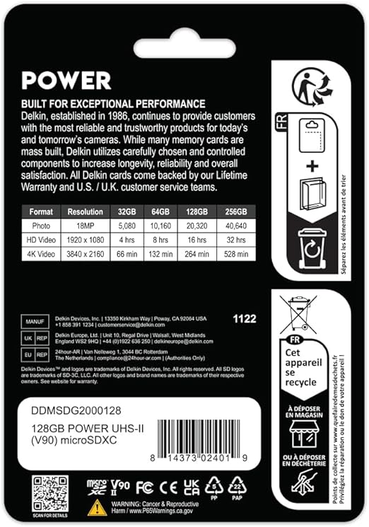 Profesyonel Sınıf Performans ve Hız: Profesyoneller için tasarlanan Delkin Devices POWER 128 GB mikro SD kart, 300 MB/sn’ye kadar okuma hızları ve 250 MB/s’ye kadar yazma hızları sunar. V90 derecelendirmesiyle, 90MB/sn sürekli yazma hızlarında kesintisiz 8K, 4K, 3D, HDR ve 360º video kaydını destekler.