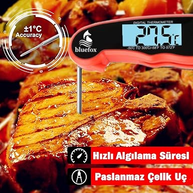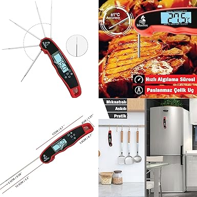 Dijital Ultra Hızlı: Bu et termometresi, sadece 2-3 saniyede sıcaklığı hızlıca ölçer ve -50 °C ile 300 °C arasındaki geniş bir aralıkta +/- 1 derece doğruluk sunar. Sıvılar, gıdalar, etler, tatlılar, hindi, çikolatalı kahve, süt ve banyo suyu için idealdir.