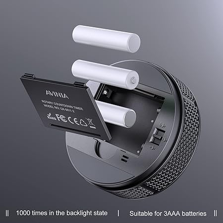 【Energibesparing och 365-dagars garanti】: Drivs av 3 AAA-batterier; om timern inte går och inte används dämpas skärmens ljusstyrka och sedan stängs den av efter några sekunder. Oroa dig inte, den förbrukar inte energi i viloläge. Varje Avinia timer har en ettårig kvalitetsgaranti och en detaljerad bruksanvisning, se till att du kan beställa den.