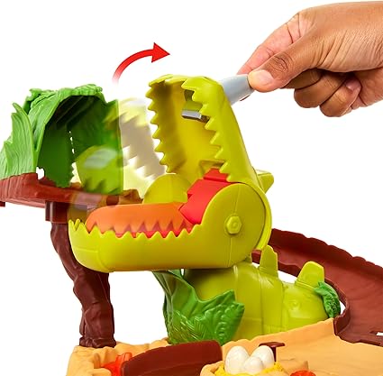 Çocuklar fırlatıcıyı kullanarak araçları lavanın üzerinden piste uçurabilir. Peki avını yakalamaya hazır dinozorun saldırısından kaçabilecekler mi?