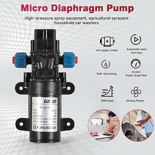 【Uygulama Kapsamı】: Yüksek basınçlı püskürtme ekipmanı, tarımsal püskürtücüler, ev tipi araba yıkayıcıları (1.5mm-1.8mm kalibreli su tabancasının basıncı en iyisidir) ve enerji tasarrufu için fazla gereksinim olmadığı durumlar için uygun 12v su pompası.