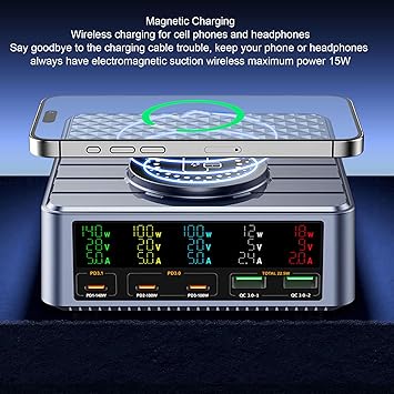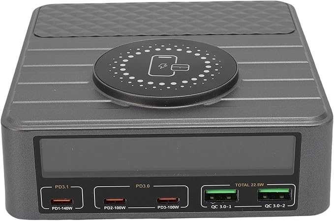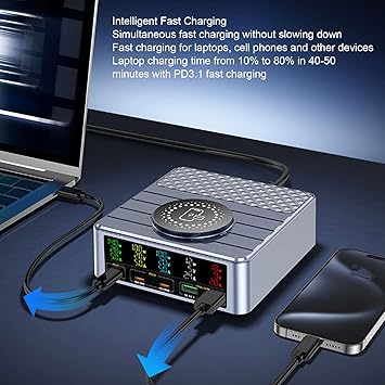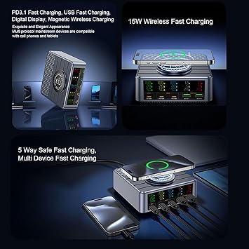 Yüksek Güçlü Hızlı Şarj: Akıllı telefonlar için toplam 260W ve dikkat çekici 140W hızlı şarj kapasitesi ile bu hızlı şarj istasyonu merkezi, verimli ve hızlı güç dağıtım için yeni nesil PD 3.1 hızlı şarj protokolünü kullanır. Uzun şarj sürelerine veda edin ve cihazlarınızı kısa sürede kullanmaya hazır tutun.