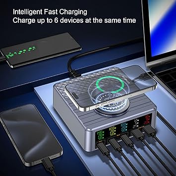 Birden fazla cihaz için eşzamanlı şarj: Taşınabilir dizüstü bilgisayar şarj istasyonu, aynı anda 6 cihaza kadar şarjı destekleyerek güç şeridinizde yer açar. Bu, özellikle ev ofisleri ve paylaşılan çalışma alanları için uygundur ve cihazlarınızı düzenli ve kolayca erişilebilir tutmanıza izin verir.