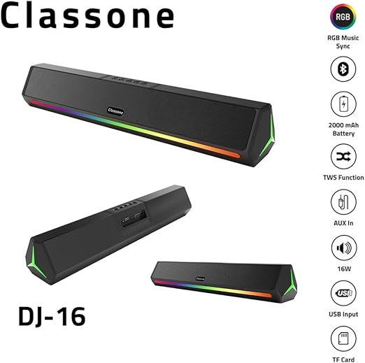 Classone DJ-16 RGB Işıklı, Bluetooth, Kablosuz Soundbar,Hoparlör