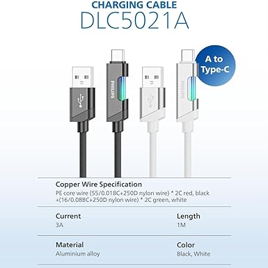 DLC5021A USB-A – Type-C Şarj Kablosu, Hızlı Şarj, 3A Yüksek Akım, 1 Metre, Dayanıklı Örgü Kablo, Çok Renkli Işık (Beyaz)