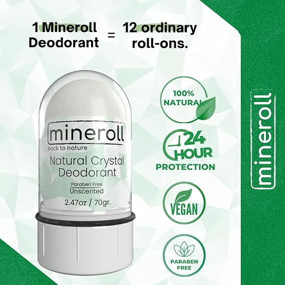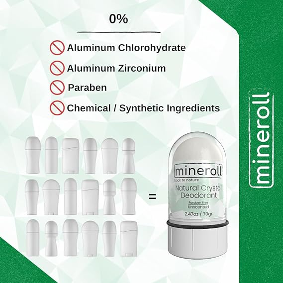 ✅ %100 DOĞAL- Mineroll Doğal Kristal Deodorant, son derece etkili mineral tuz ve arıtılmış sudan yapılmıştır; doğal vücut fonksiyonlarını bozmadan kötü bakterilerin neden olduğu ter kokusuna karşı korur.