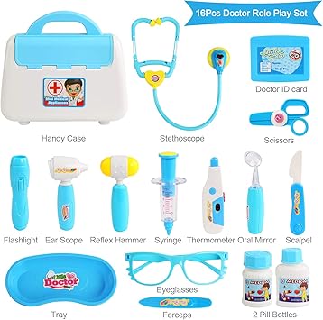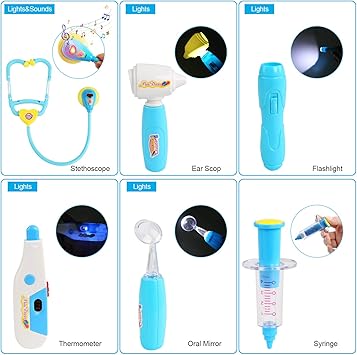 Güvenli ve dayanıklı: Doktor oyuncağı yüksek kaliteli, çevre dostu, gıda sınıfı ABS plastikten üretilmiştir Sertifikalı toksiksiz, BPA içermez, kurşunsuz ve ftalat içermez Pürüzsüz yüzey, keskin kenarları yok Süper değer seti: 16 parçalı rol yapma seti, stetoskop, cımbız, neşter, şırınga, makas, refleks çekiç, işitme koruması, ağız aynası, 2 hap şişesi, el feneri, termometre, tepsi, gözlük, doktor kartı ve kullanışlı bir kılıf