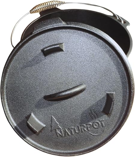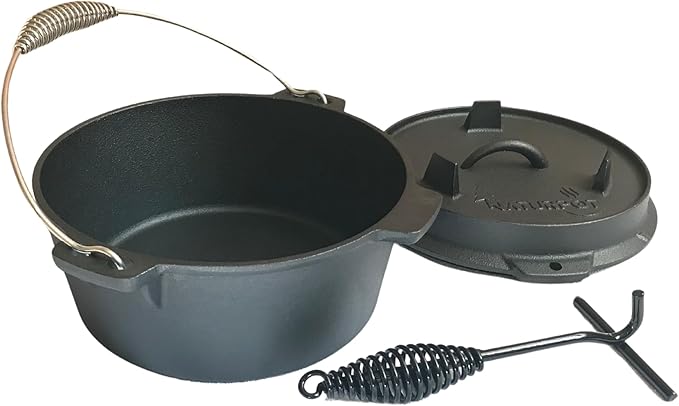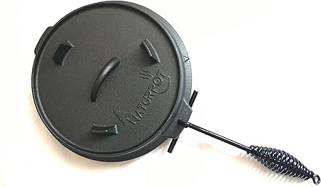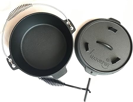 – Gerçek Demir Döküm Kamp Tenceresi (emaye kaplama olmayan saf dökme demir) – Kapak kaldırıcı aparat kutu içinde gelir. – Spiral askısı sayesinde kolay kavranır ve üç ayak askıya aılır. – 25 cm çapında (10 inç), yaklaşık 6 kilogram ağırlığa ve 4 litre hacme sahip.
