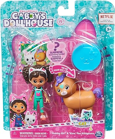 Sette, yaklaşık 10 cm boyunda, sevimli yeşil tulumlu Gabby figürüne ek olarak, aksiyon fonksiyonlu sevimli gökkuşağı tek boynuzlu at Kico (yine yaklaşık 10 cm boyunda) yer alır: Kico’nun vücudunu aşağıya bastırıp bıraktığınızda Kico yukarı ve aşağı sallanır