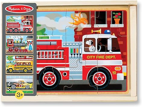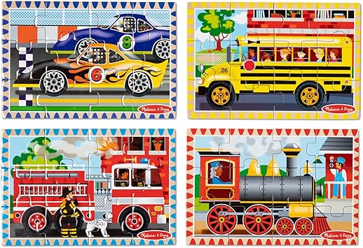 4 adet 12 parçalık yapboz içerir, 1 yarış arabası, 1 lokomotif, 1 itfaiye aracı ve 1 okul otobüsü