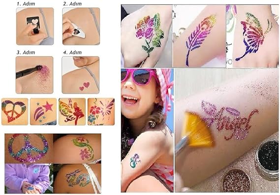 Dövme Glitter Tattoo Kit 10 tüp Sim 100 şablon hediyeli Mega PaketUygunluk: 994 adet stokta