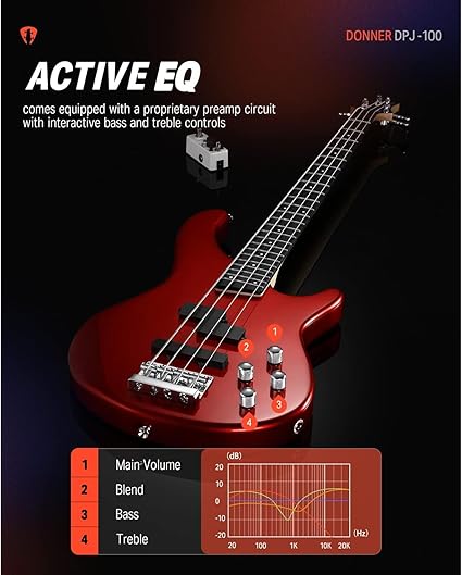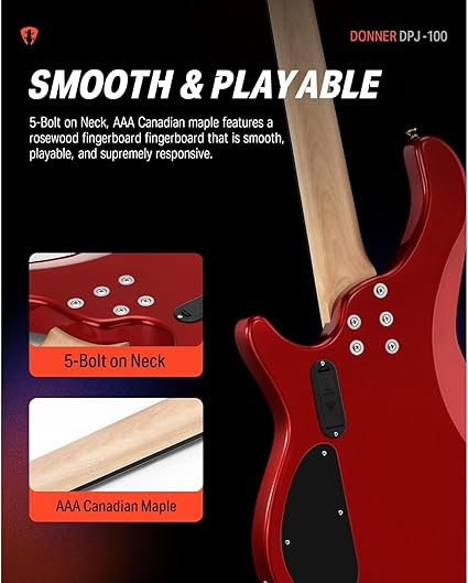 Teknik özellikler Gövde: Kavak ağacı Klavye: Indian laurel Sap: AAA Akçaağaç Sap profili: C Manyetikler: Donner P-J Style Elektronik: Aktif preamp Kontroller: Volume, Tone, Bass, Treble Renk: Kırmızı
