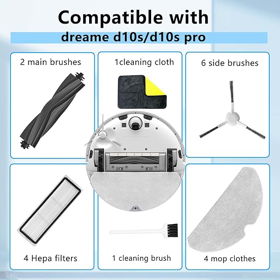 Dreame D10s/D10s pro elektrikli süpürge için 18 adet yedek paket: 6 yan gül, 4 adet paspas pedi, 4 adet HEPA filtresi, 2 ana fırça