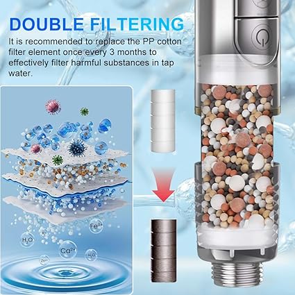 Çok katmanlı filtre sistemi: Yüksek basınçlı duş başlığı, üç çeşit mineral taş ve yüksek kaliteli bir PP pamuk filtre elemanı kullanan gelişmiş, çok katmanlı bir filtre sistemi ile donatılmıştır. Bu filtre sistemi kloru, florür, ağır metalleri, bakterileri, pası ve sudaki hoş olmayan kokuları etkili bir şekilde giderir. Dengeli pH değeri sağlar ve cildinizi ve saçlarınızı sert suyun olumsuz etkilerine karşı korur. Entegre, sızdırmaz conta, kum ve tozun duş başlığına girmesini önler.