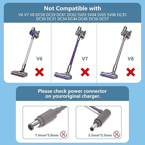 SICAK İPUÇLARI: Lütfen satın almadan önce elektrikli süpürge modelinizi, fişin şeklini ve elektrikli süpürge akünüzün çalışma durumunu kontrol edin. Lütfen şarj cihazı ve elektrikli süpürge arasındaki fişin şarj cihazının orijinal fişi ile aynı olduğundan emin olun. Bu Dyson şarj cihazının elektrikli süpürgeniz için uygun olup olmadığından emin değilseniz, lütfen satın almadan önce bizimle iletişime geçin.