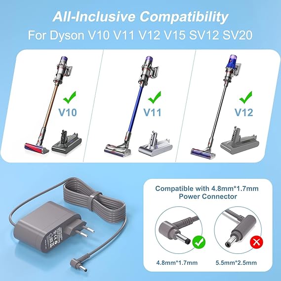 Dyson V12 V15 serisi elektrikli süpürgeler için, Dyson V12 Detect Slim Total Clean Extra, Fluffy/Absolute Extra ve Dyson V15 Detect Total Clean Extra, Absolute Extra Cordless Vacuum yedek güç kablosu adaptörü