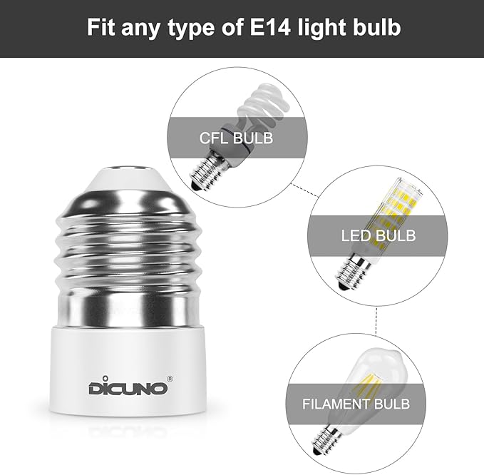 【Çok yönlü seçim】E27 ila E14 duylu DiCUNO lamba duyu dönüştürücü, ışık sisteminiz için ampul değiştirirken size geniş bir seçenek sunar. Mısır koçanı, vintage mum lambaları, damla lambalar ve daha fazlası gibi küçük lambalar ve büyük ampuller arasında kolayca geçiş yapabilirsiniz.