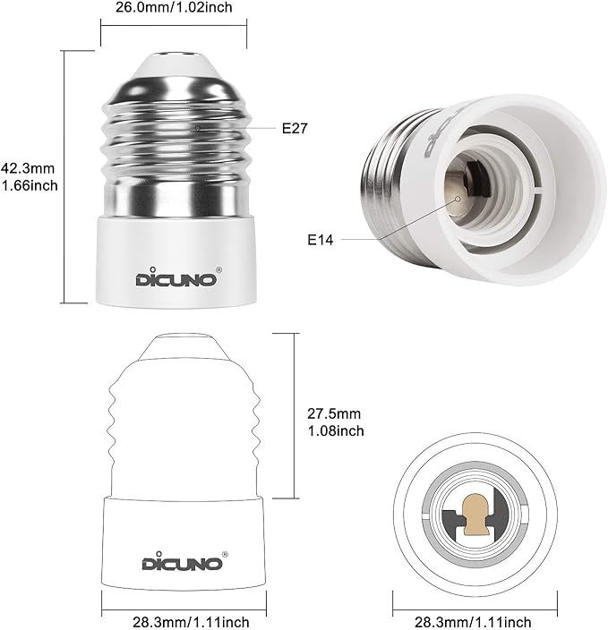 【Özellikler】0 – 200 W güç, 0 – 250 V gerilim ve 165 °C’ye kadar etkileyici sıcaklık dayanımı ile DiCUNO E27 E14 duy adaptörü optimum işlevsellik sunar. Toplam uzunluğu 4,23 cm ve toplam genişliği 2,83 cm olan LED lambalar, geleneksel ampuller, CFL lambalar ve E14 duylu halojen lambalar için mükemmeldir.