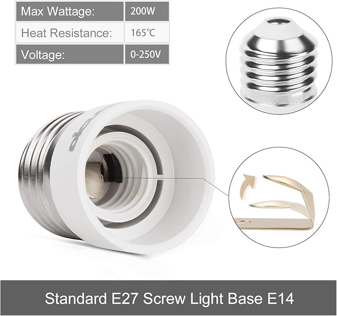 【Sağlam malzeme】DiCUNO E27 E14 duy adaptörü yüksek kaliteli alüminyum ve PBT plastikten üretilmiştir. Standart bir E27 duy (lamba duyu bağlantısı) ve E14 duyu (lamba bağlantısı) vardır. Olağanüstü alev ve 165 °C’ye kadar etkileyici ısı dayanıklılığı sayesinde son derece uzun ömürlü ve evde kullanım için idealdir.