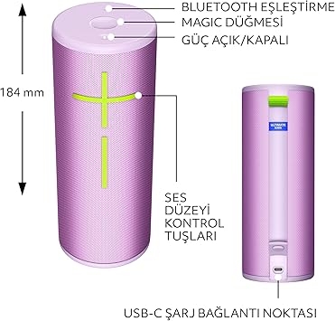 Dayanıklı yapı: IP67 su geçirmezlik derecesine sahip ve 15 metreden düşmeye dayanıklı BOOM 4 Bluetooth hoparlör su üzerinde yüzebilir. PartyUp özelliği: Ultimate Ears BOOM uygulamasındaki PartyUp özelliği ile birden fazla BOOM, MEGABOOM, EVERBOOM, EPİCBOOM ve HYPERBOOM taşınabilir Bluetooth hoparlörü eşleştirerek surround ses deneyimi yaratın