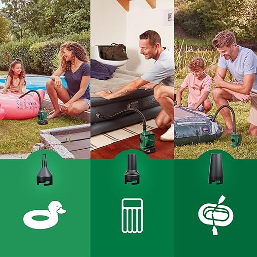 Esnek kullanım: 3 hava pompası başlığı ile havuz oyuncakları, şişme botlar veya şişme yataklar gibi birçok şişirilebilir eşyayı şişirmek için uygundur