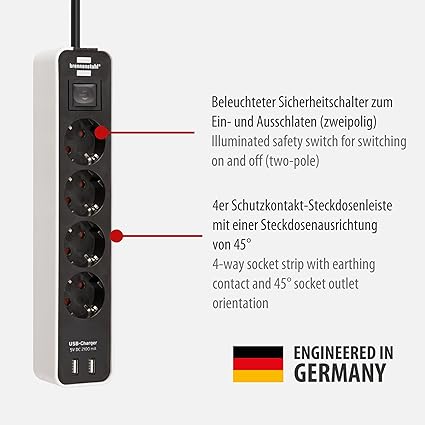 4’lü topraklı çoklu priz, 1,5 m kablo uzunluğu (H05VV-F 3G1,5) ve 45° priz yönü ile