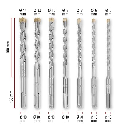 Hepsi bir arada çözüm – 7 parçalık beton matkap ucu seti, beton üzerinde çok yönlü delme işleri için en önemli çapları içerir: 2x 6 / 2x 8 / 10 / 12 / 14 mm.