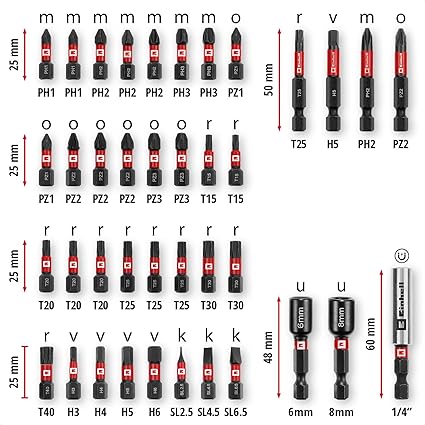 Darbeye dayanıklı uçlar – Einhell seti C 6.3 şaftlı 25 mm uçlar ve sağlam S2 çelikten yapılmış E 6.3 şaftlı 50 mm uçlar içerir.