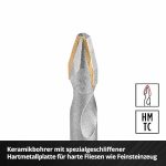Mükemmel uyum – Seramik matkap uçları ile fayans delindikten sonra, duvar matkap uçları karbür uçları sayesinde duvarlarda hızlı ve temiz sonuçlar elde eder.