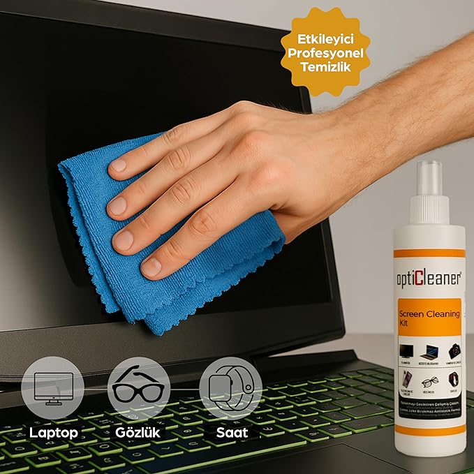 Ekran Temizleme Seti – 250 ml Sprey + Özel Mikrofiber Bez | Bilgisayar, Laptop, Tablet, TV, Telefon, Yazıcı, Kamera & Gözlük İçin Antistatik, Çizmez ve Parlatıcı