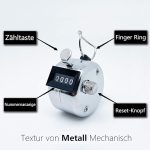 0 ila 9999 arasında güvenilir bir şekilde sayar, hoş bir tıklama sağlar ve aynı zamanda stres giderici görevi görür. Sağ taraftaki ayar tekerleği ile sıfıra kolayca sıfırlanır.