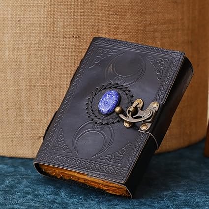 El Yapımı Deri Günlük Lapis Taşı Kristal Siyah Üçlü Ay – Gölgeler Kitabı, Antika Deckle Kenar Kağıdı – Eskiz Defteri, Grimoire, Boş Büyü Kitabı, Kutsal Geometri