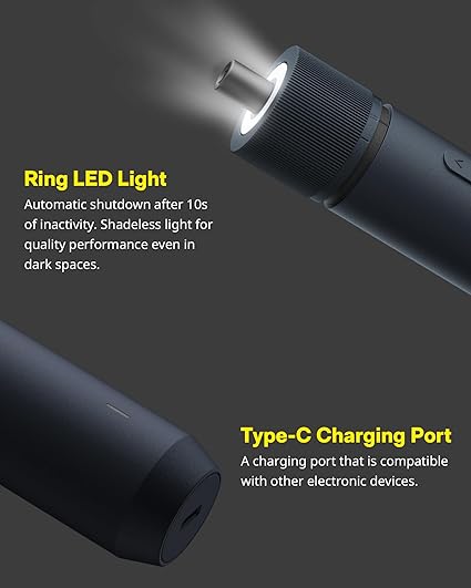 ULTRA UYGUN – Uzun ömürlü dayanıklılık için 60HRC mukavemetli 25 katı S2 çelik matkap ucu (1 x Manyetik Uzun Uç | 24 x Normal Uç). Manyetik uçla göz açıp kapayıncaya kadar uçları değiştirin ve uzatma çubuğu ile sıkı noktalarla mücadele edin. Ve otomatik açık, gölgesiz dairesel LED. Avucunuzda mini bir ışık gösterisi, karanlıkta bile sizi bir maestroya dönüştürüyor. İster mobilya montajı, ister kendin yap maceralarına dalıyor olun, ister elektrikli onarımlarla uğraşıyor olun, bu elektrikli tornavida seti arkanızda