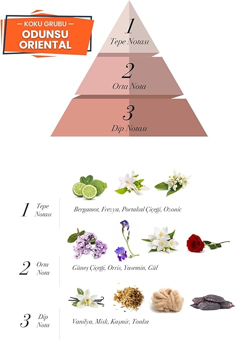 KOKU NOTALARI: EDP parfüm (Eau de Parfum) yoğunluk olarak en fazla koku veren parfümlerdir, etkisini gün boyu yanınızda hissedersiniz Tepe notalarında bergamot, ozonik, portakal çiçeği ve frezya bulunur. Bu notalar, parfüme taze ve enerjik bir başlangıç sağlar. Orta notalarda gül, yasemin, kediotu ve orris bulunur, bu notalar parfüme çiçeksi ve zarif bir dokunuş katar. Dip notalarda ise misk, tonka, kaşmir ve vanilya bulunur, bu notalar parfüme sıcak ve baştan çıkarıcı bir his kazandırır.