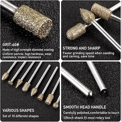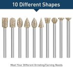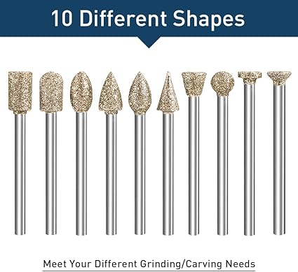 DIY Meraklıları için Harika Hediye】: 10 Farklı Şekilde elmas taşlama çapak uçları, küre, koni, silindir, yuvarlak başlı silindir, mermi vb. içerir, Zengin miktar ve çeşitli şekiller birçok taşlama ve oyma ihtiyacınızı karşılar.