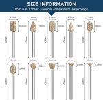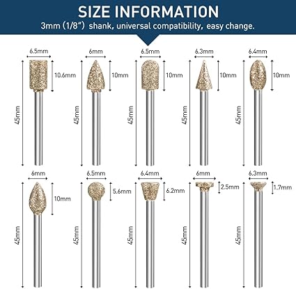 【3mm (1/8″) şaft】: Elmas taşlama çapaklı matkap uçları seti çoğu matkap, döner alet veya kalıp taşlama makinesi için uygundur. Yüksek uyumluluk, kolay değişim.
