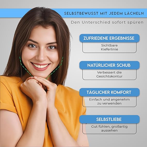 Tanımlı yüz ve çene çizgisi: Kullanımı kolay tek bir çene kurtarıcıyla tüm önemli yüz, çene ve boyun kaslarını hedef alır. Çift çeneyi azaltmak ve daha belirgin ve genç bir görünüm için gevşek cildi sıkılaştırmak için mükemmeldir