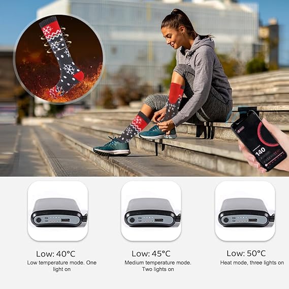3-Gear Temperature Setting: These electric heated socks come with three temperature settings, namely in low – 40°C/104°F, medium – 45°C/113°F, high – 50°C/122°F, allowing you to choose the level of warmth that suits you best.