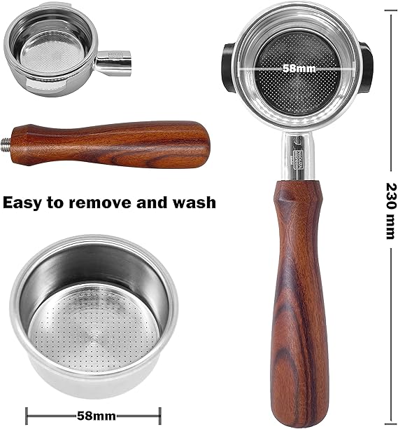 Yüksek Kaliteli Malzeme – Kalın ve gıda sınıfı 304 paslanmaz çelikten imal edilen 58 mm dipsiz portafillter güvenli, hijyenik ve korozyon önleyicidir. Sapı, her biri benzersiz bir renge ve taneye sahip yüksek kaliteli doğal gül ağacından yapıldığı için tutmak çok rahattır.