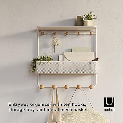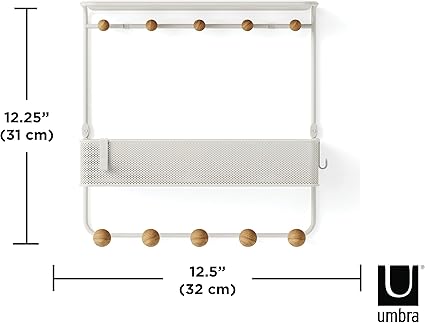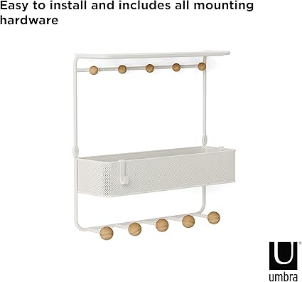 BENZERSİZ, ÇOK AMAÇLI DEPOLAMA ÇÖZÜMÜ: Estique, delikli metal bir hazne, ahşap düğmeli 10 kanca ve entegre bir tepsiye sahiptir; Toplam 18 kg ağırlık kapasitesi. 18 kg.
