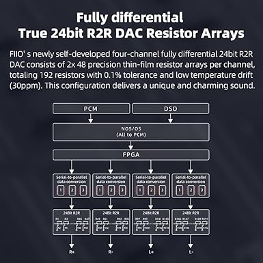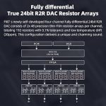 Tamamen diferansiyel tamamlayıcı 24 bit R2R direnç merdiveni DAC kullanarak, daha düşük gürültü, FFT’de daha az harmonik bileşen ve tamamlayıcı olmayan mimarilere kıyasla daha koyu bir müzikal arka plan sunar.