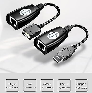 Özellikler: USB özellikli bir bilgisayardan bir USB cihazının mesafesini 50 Metre’ye kadar uzatır.USB kameralar, yazıcılar, web kameraları uzantıları ve diğer USB cihazlarıyla kullanım için idealdir. Kendi kendine çalışır, böylece harici güç kaynağı gereklidir Standart Cat5/Cat5E/Cat6 yama kablosunu kullanır Net ağırlık: 49g