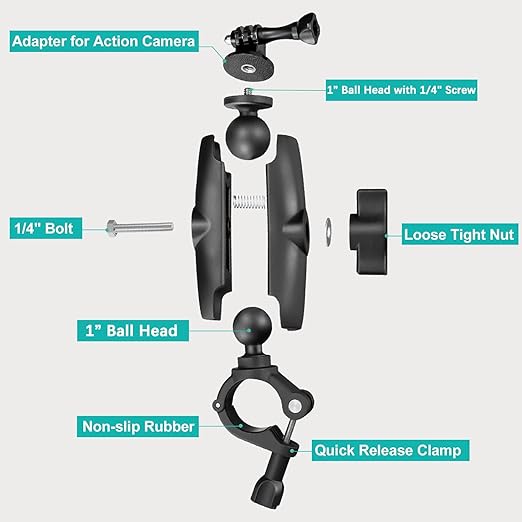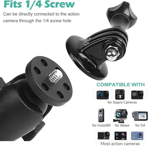 Geniş Uyumluluk — GoPro Hero 12 11 10 9 8 7 6 5 siyah serisi, DJI OSMO aksiyon, AKASO, Insta 360 GO 3/X4/X3/ONE RS/ONE X2/ONE X/ONE R/GO 2, Mevo Start, Dijital Kamera ve daha fazla aksiyon kamerası ile uyumludur. Paket içeriği: gidon kelepçe montajı*1, Gopro adaptörü* 1, yumuşak kauçuk* 2.