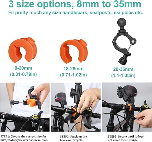 8 – 35 mm Klips Mesafesi ve Kayma Önleyici — Kelepçe, yaklaşık 8 – 35 mm çapında yuvarlak bir çubuk için uygundur. Kelepçe konumunu düğme ile serbestçe ayarlayabilirsiniz. Plaka üzerinde lastik bir ped ve kelepçeye ekstra tutuş sağlamak ve taktığınız her şeyi korumak için 2 yumuşak kauçuk vardır