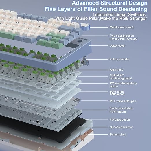 İç Katmanlar Klavyenin iç yapısında bulunan PO ses pamuğu, IXPE izolasyon, PET ses izolasyonu ve PO alt ses pamuğu, üstün ses yalıtımı ve yazma konforu sağlar. Kasa içi silikon alt taban ise ekstra stabilite ve dayanıklılık kazandırır.
