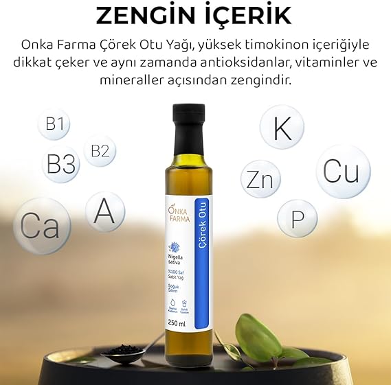 MİNİMUM %25 TİMOKİNON İÇERİR: Hammadde testlerimizde, çörek otu yağımızın minimum %25 Timokinon bileşeni içermesini hedefliyoruz. Timokinon, çörek otu yağı içerisindeki karakteristik bileşendir ve çörek otu yağının faydaları için vazgeçilmezdir.